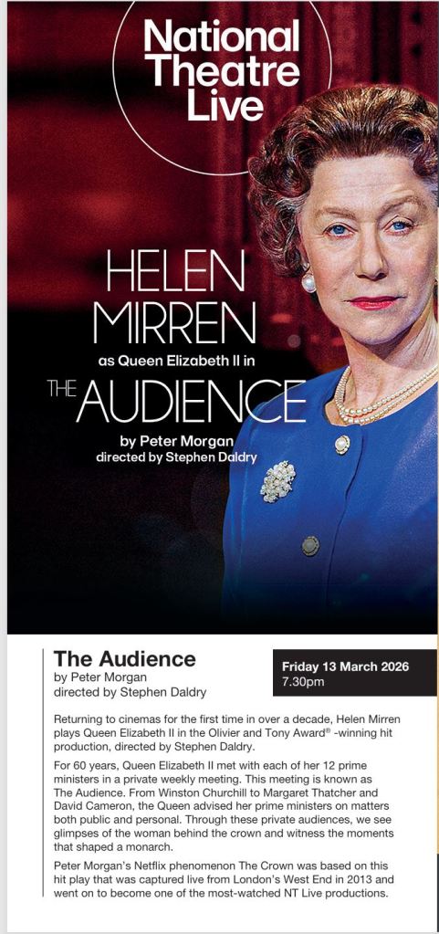 We are pleased to announce that we are able to show you live performances from the National Theatre. Our next date is the 13th March 2026. Please see posters below: